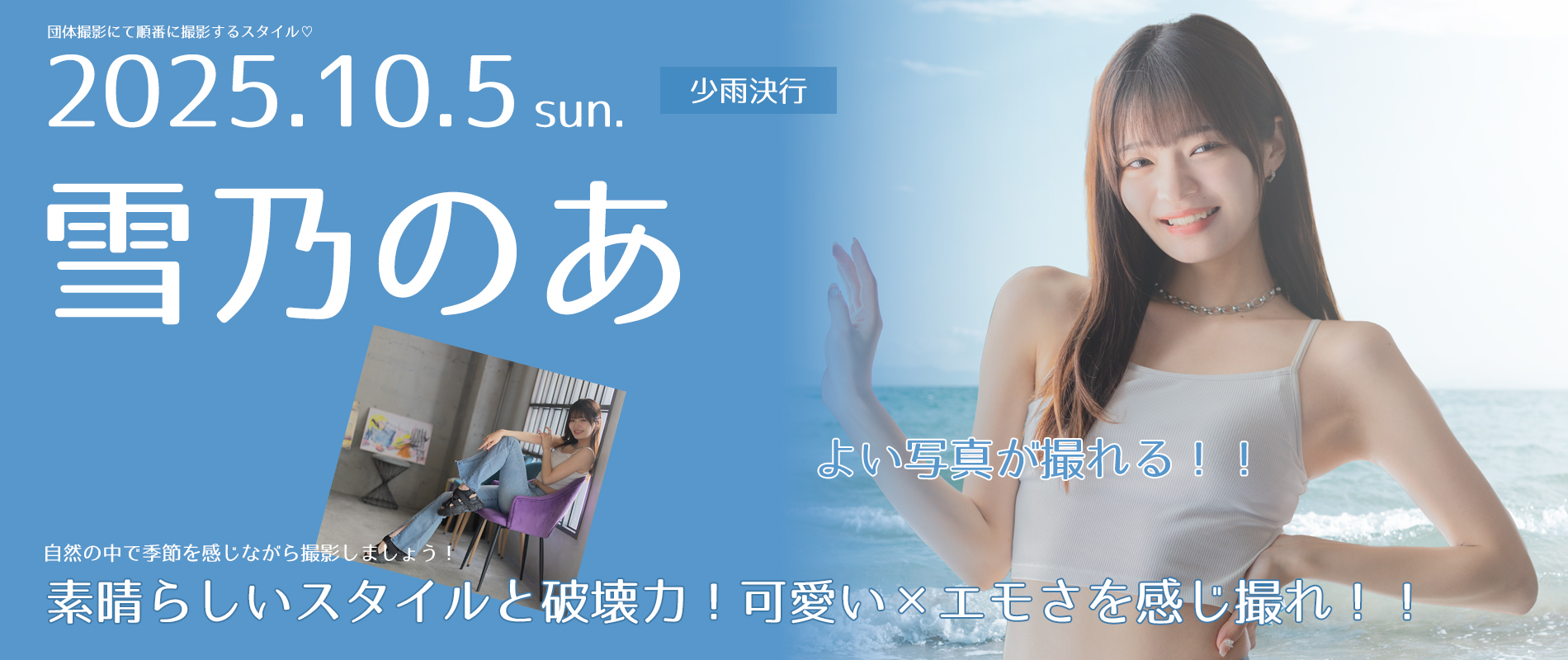 710/5 雪乃のあ 団体撮影会出演 申込フォーム 2024.03.142026.01.20 雨天対応のため開催場所を名古屋市内スタジオに変更いたします ※当日参加→052-680-8086まで 氏名 メールアドレス 携帯電話番号など twitter/Instagram 掲載される方は必須 開催内容 10月5日(日) 雪乃のあ 団体撮影会 ■各部ともにモデルを順番に撮影していただきます ■衣装は各部1着×3部 ■内海海岸(砂浜/防波堤/田舎道/海岸道路など)→スタジオに変更※天候によりロケあり 参加希望部 各部10,000円 募集枠7 第1部/10:30-12:00 【残枠1】第2部/13:20-14:50【残枠1】第3部/15:30-17:00【残枠1】 集合場所:名古屋市千種区今池1-17-15 ※スタジオ集合に変更いたしました 最寄駅:地下鉄今池駅9番出口 周辺に有料駐車場多数(1回500円~1000円季節により変動) ★お申込みから36時間以内に確認メール(確定orキャンセル待ち)が届かない場合は必ずご連絡ください! 連絡事項 (任意) ※下記規約に同意にチェックをお忘れなく 規約・ルールを確認し了承のうえ申込いたします